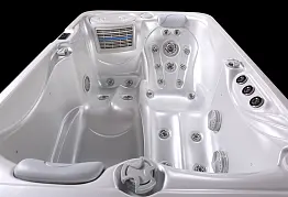 Профессиональный плавательный спа-бассейн с тремя форсунками противотока, на каждую из которых приходится по одному мощному насосу в 3 лс. Силу потока воды и направление любой плавательной форсунки можно настроить индивидуально, что важно как для любителя, так и для профессионального пловца. Дополнительно по обе стороны бассейна расположены по 1 поручню с подсветкой для различных упражнений. В спа-зоне с комфортом разместятся 4 человека, на трех сидячих и одном лежачем месте.